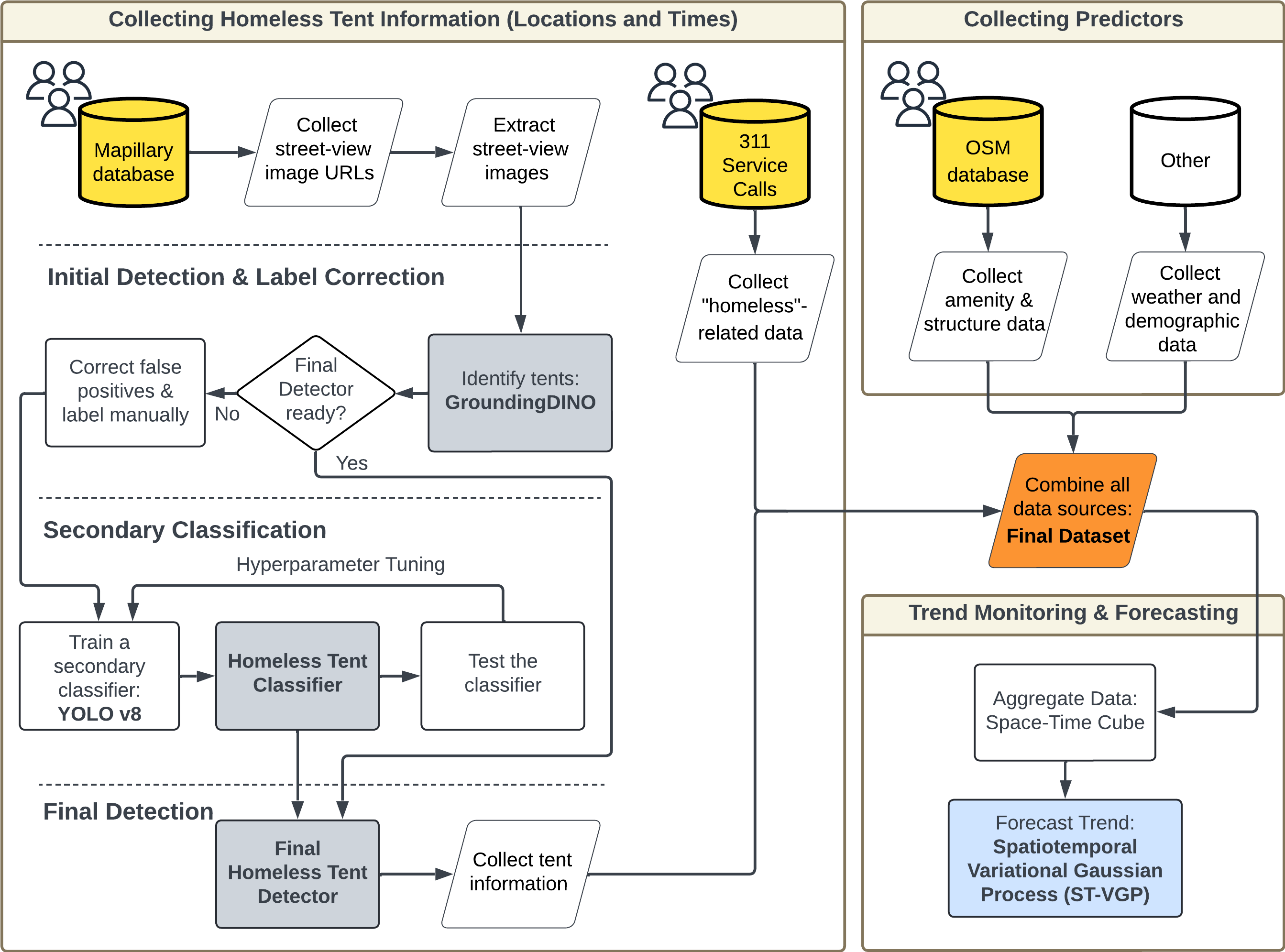 Homelessness in the United States remains a persistent and growing crisis, further complicated by a shortage of high-quality, high-resolution data. The existing Point-in-Time (PIT) count data has several limitations, as it relies on single-night counts with inconsistent coverage and cannot capture the dynamic and seasonal nature of unsheltered homelessness. To address this gap, we integrate multiple crowdsourced data sources—including 311 Service Call records, Mapillary street-view images, and OpenStreetMap (OSM) amenities—into a spatiotemporal variational Gaussian Process (ST-VGP) model for monitoring and predicting daily homeless tent trends. Using San Francisco as a case study, we leverage quarterly tent counts from the city’s Department of Emergency Management to calibrate and validate the model over the period from January 2016 to May 2024. Our results demonstrate that crowdsourced data provide fine-grained insights into the spatial and temporal dynamics of homelessness, thereby complementing the PIT counts. We find that tents dispersed from downtown to other parts of the city following aggressive crackdown policies in 2018, highlighting the unintended consequences of short-term enforcement measures. Moreover, urban amenities and structures such as banks, restaurants, bridges, and highway ramps are significantly associated with tent locations. These findings underscore the transformative potential of crowdsourced data for designing sustainable, data-driven homelessness interventions. By offering a cost-efficient and adaptive framework, our approach enables policymakers and service providers to allocate resources proactively, evaluate policy effectiveness, and move toward systemic solutions for ending homelessness.